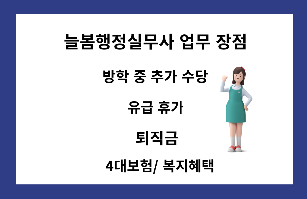 늘봄행정실무사는 교육 공무직에 속하여 고용 안정성이 높은 직업입니다. 기본적인 월급과 함께 4대 보험, 각종 복지 혜택이 제공되어 비교적 안정적인 생활이 가능합니다.