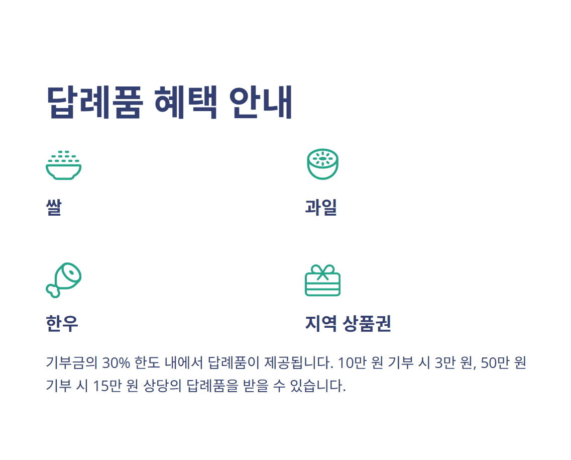 - 답례품 추가 혜택: 지역 특산품, 체험권, 상품권으로 기부 이상의 가치 제공