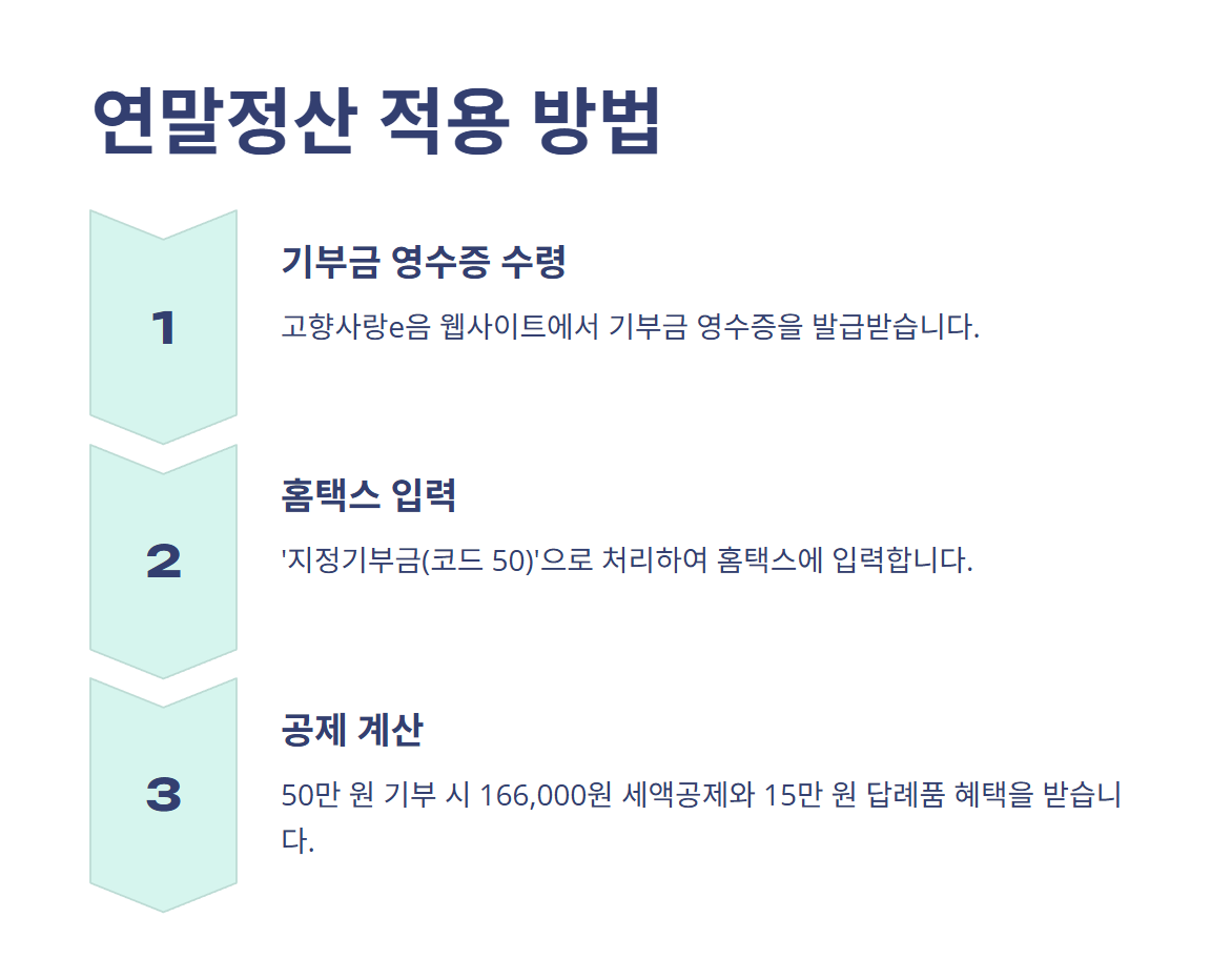 고향사랑기부금 납부 후, 기부금 영수증을 발급받아 연말정산 시 홈택스에 제출하면 세액공제가 적용됩니다.