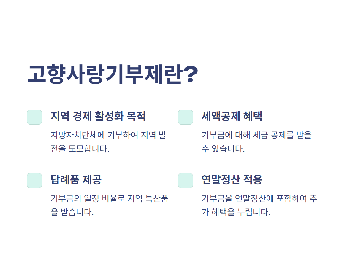 - 지역경제 활성화: 지방 자치단체를 지원하며 지역발전에 기여 고향사랑기부제는 단순한 기부를 넘어 절세와 보람을 동시에 느낄 수 있는 제도입니다.