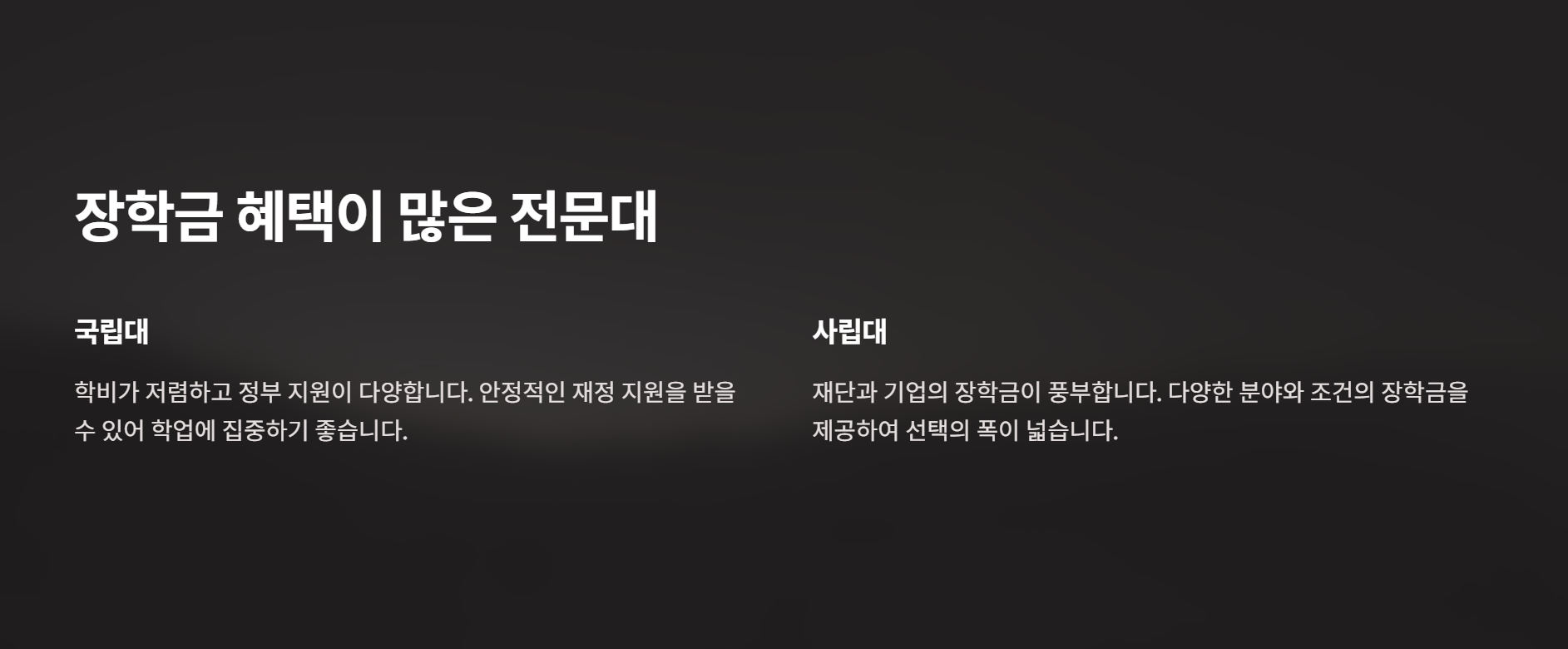 국공립 전문대: 국립대는 학비가 저렴하고, 정부 지원을 통해 다양한 장학금 제도를 운영하는 경우가 많습니다.
