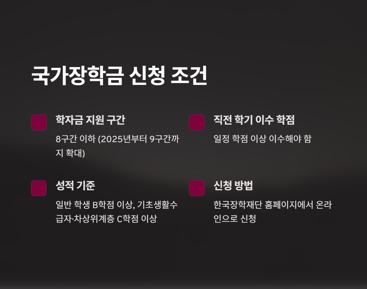 - 학자금 지원 구간: 일반적으로 8구간 이하인 학생이 신청 가능하지만, 2025년부터는 9구간까지 확대되어 더 많은 학생들이 혜택을 받을 수 있게 되었습니다.